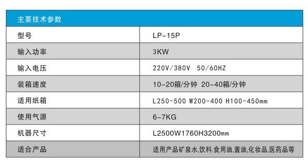 综合国内外各种装箱机特点,新型研制成功自动装箱机,根据装箱要求自动将产品整理排列,新型设计,结构新颖,操作简便,移动方便,电脑控制,伺服驱动,动作稳定产品关键零部件和电器采用进口件,适用于PET瓶塑料瓶,玻璃瓶,啤酒,饮料,食品,化工,医药,二片罐和三片罐等行业自动装箱工序。产品关键零部件和电器采用进口件。